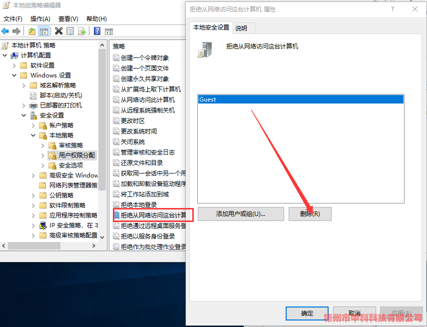 (1)、計(jì)算機(jī)配置->Windows設(shè)置->安全設(shè)置->本地策略->用戶權(quán)限分配->拒絕從網(wǎng)絡(luò)訪問(wèn)這臺(tái)計(jì)算機(jī)->刪除Guest