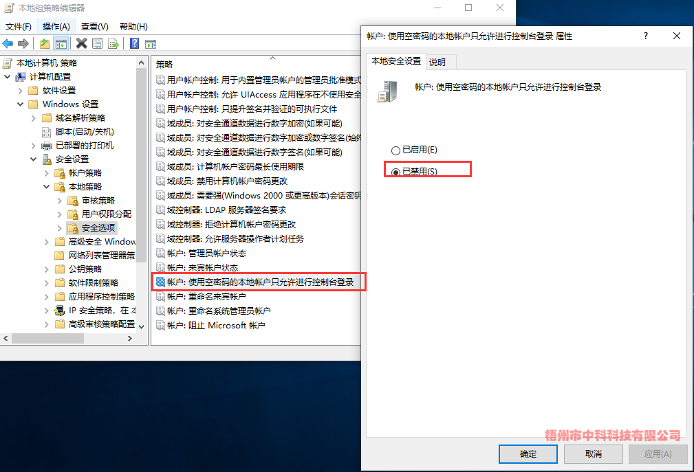 (2)、計(jì)算機(jī)配置->Windows設(shè)置->安全設(shè)置->本地策略->安全選項(xiàng)->帳戶:使用空密碼的本地帳戶只允許進(jìn)行控制臺(tái)登錄->已禁用