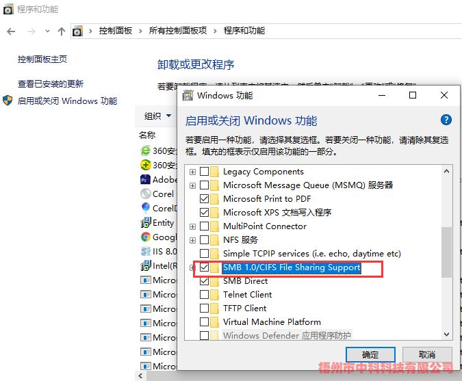 在控制面板中,打開(kāi)“程序和功能”->啟用或關(guān)閉Windows功能->將“SMB 1.0/CIFS File Sharing Support”勾選->確定